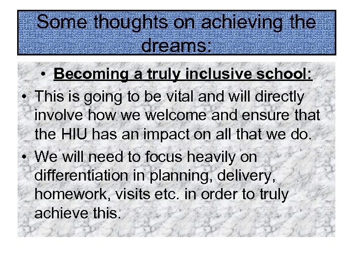 Some thoughts on achieving the dreams: • Becoming a truly inclusive school: • This is going to be vital and will directly involve how we welcome and ensure that the HIU has an impact on all that we do. • We will need to focus heavily on differentiation in planning, delivery, homework, visits etc. in order to truly achieve this.
