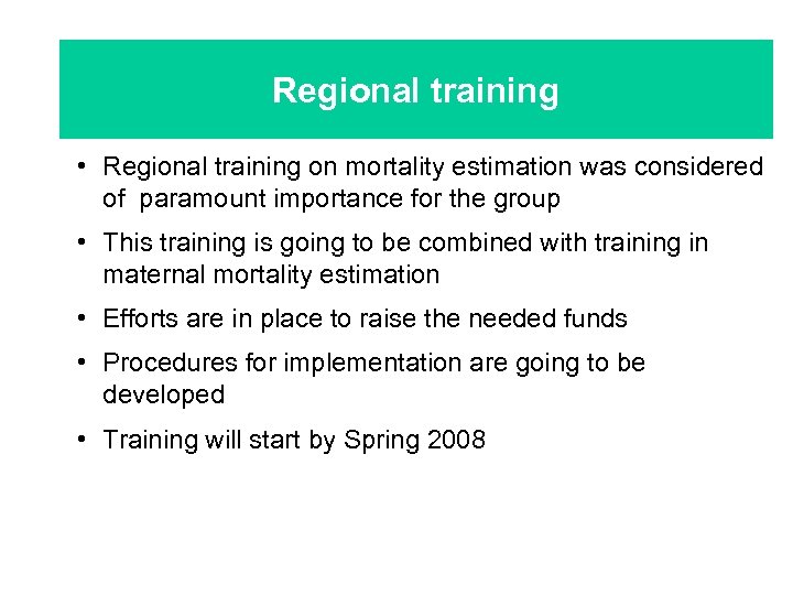Regional training • Regional training on mortality estimation was considered of paramount importance for the group • This training is going to be combined with training in maternal mortality estimation • Efforts are in place to raise the needed funds • Procedures for implementation are going to be developed • Training will start by Spring 2008