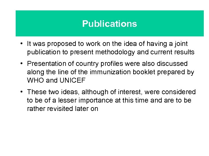 Publications • It was proposed to work on the idea of having a joint publication to present methodology and current results • Presentation of country profiles were also discussed along the line of the immunization booklet prepared by WHO and UNICEF • These two ideas, although of interest, were considered to be of a lesser importance at this time and are to be rather revisited later on