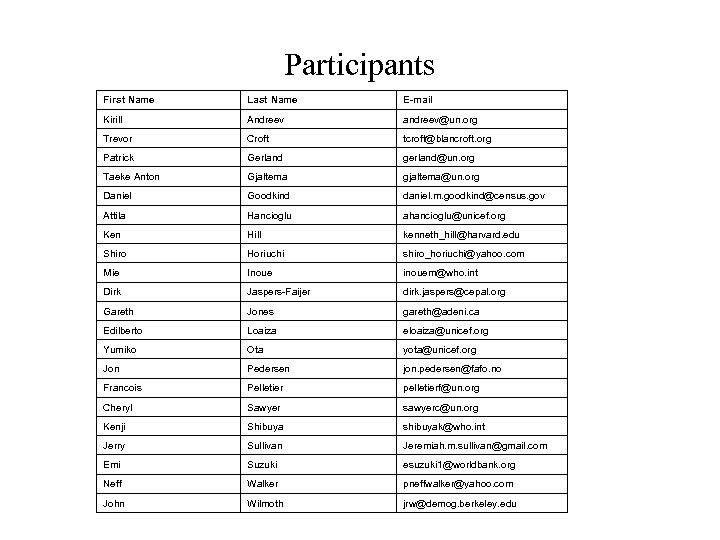 Participants First Name Last Name E-mail Kirill Andreev andreev@un. org Trevor Croft tcroft@blancroft. org Patrick Gerland gerland@un. org Taeke Anton Gjaltema gjaltema@un. org Daniel Goodkind daniel. m. goodkind@census. gov Attila Hancioglu ahancioglu@unicef. org Ken Hill kenneth_hill@harvard. edu Shiro Horiuchi shiro_horiuchi@yahoo. com Mie Inoue inouem@who. int Dirk Jaspers-Faijer dirk. jaspers@cepal. org Gareth Jones gareth@adeni. ca Edilberto Loaiza eloaiza@unicef. org Yumiko Ota yota@unicef. org Jon Pedersen jon. pedersen@fafo. no Francois Pelletier pelletierf@un. org Cheryl Sawyer sawyerc@un. org Kenji Shibuya shibuyak@who. int Jerry Sullivan Jeremiah. m. sullivan@gmail. com Emi Suzuki esuzuki 1@worldbank. org Neff Walker pneffwalker@yahoo. com John Wilmoth jrw@demog. berkeley. edu