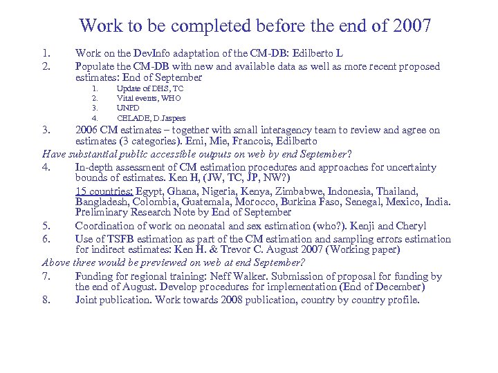 Work to be completed before the end of 2007 1. 2. Work on the Dev. Info adaptation of the CM-DB: Edilberto L Populate the CM-DB with new and available data as well as more recent proposed estimates: End of September 1. 2. 3. 4. 3. Update of DHS, TC Vital events, WHO UNPD CELADE, D. Jaspers 2006 CM estimates – together with small interagency team to review and agree on estimates (3 categories). Emi, Mie, Francois, Edilberto Have substantial public accessible outputs on web by end September? 4. In-depth assessment of CM estimation procedures and approaches for uncertainty bounds of estimates. Ken H, (JW, TC, JP, NW? ) 15 countries: Egypt, Ghana, Nigeria, Kenya, Zimbabwe, Indonesia, Thailand, Bangladesh, Colombia, Guatemala, Morocco, Burkina Faso, Senegal, Mexico, India. Preliminary Research Note by End of September 5. Coordination of work on neonatal and sex estimation (who? ). Kenji and Cheryl 6. Use of TSFB estimation as part of the CM estimation and sampling errors estimation for indirect estimates: Ken H. & Trevor C. August 2007 (Working paper) Above three would be previewed on web at end September? 7. Funding for regional training: Neff Walker. Submission of proposal for funding by the end of August. Develop procedures for implementation (End of December) 8. Joint publication. Work towards 2008 publication, country by country profile.