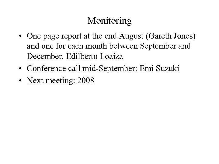 Monitoring • One page report at the end August (Gareth Jones) and one for each month between September and December. Edilberto Loaiza • Conference call mid-September: Emi Suzuki • Next meeting: 2008
