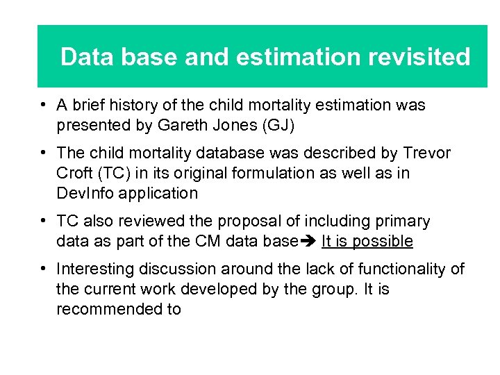 Data base and estimation revisited • A brief history of the child mortality estimation was presented by Gareth Jones (GJ) • The child mortality database was described by Trevor Croft (TC) in its original formulation as well as in Dev. Info application • TC also reviewed the proposal of including primary data as part of the CM data base It is possible • Interesting discussion around the lack of functionality of the current work developed by the group. It is recommended to