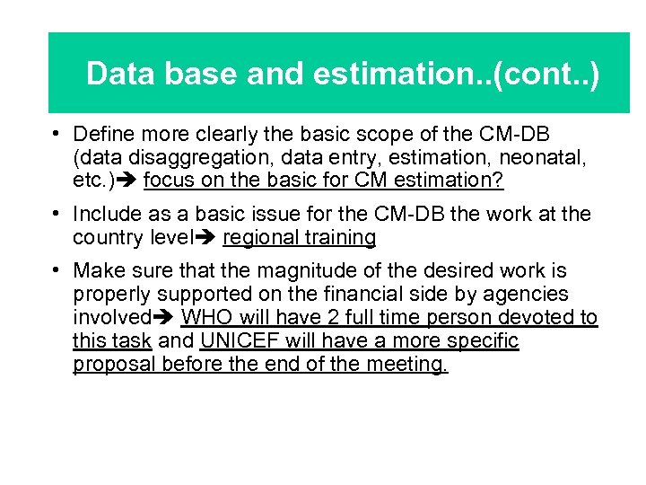 Data base and estimation. . (cont. . ) • Define more clearly the basic scope of the CM-DB (data disaggregation, data entry, estimation, neonatal, etc. ) focus on the basic for CM estimation? • Include as a basic issue for the CM-DB the work at the country level regional training • Make sure that the magnitude of the desired work is properly supported on the financial side by agencies involved WHO will have 2 full time person devoted to this task and UNICEF will have a more specific proposal before the end of the meeting.