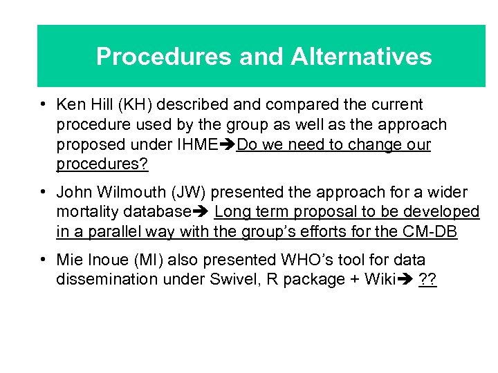 Procedures and Alternatives • Ken Hill (KH) described and compared the current procedure used by the group as well as the approach proposed under IHME Do we need to change our procedures? • John Wilmouth (JW) presented the approach for a wider mortality database Long term proposal to be developed in a parallel way with the group’s efforts for the CM-DB • Mie Inoue (MI) also presented WHO’s tool for data dissemination under Swivel, R package + Wiki ? ?