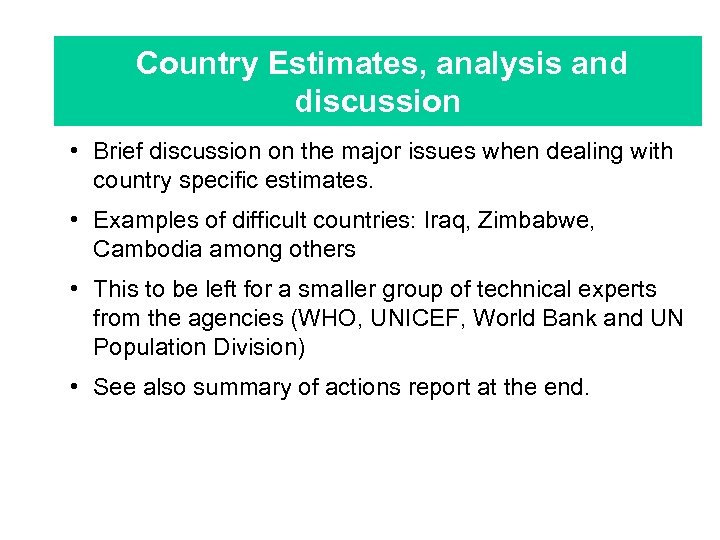 Country Estimates, analysis and discussion • Brief discussion on the major issues when dealing with country specific estimates. • Examples of difficult countries: Iraq, Zimbabwe, Cambodia among others • This to be left for a smaller group of technical experts from the agencies (WHO, UNICEF, World Bank and UN Population Division) • See also summary of actions report at the end.