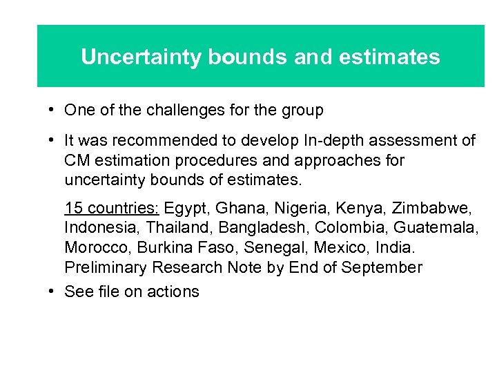 Uncertainty bounds and estimates • One of the challenges for the group • It was recommended to develop In-depth assessment of CM estimation procedures and approaches for uncertainty bounds of estimates. 15 countries: Egypt, Ghana, Nigeria, Kenya, Zimbabwe, Indonesia, Thailand, Bangladesh, Colombia, Guatemala, Morocco, Burkina Faso, Senegal, Mexico, India. Preliminary Research Note by End of September • See file on actions