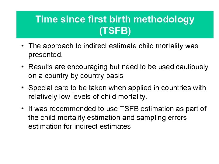 Time since first birth methodology (TSFB) • The approach to indirect estimate child mortality was presented. • Results are encouraging but need to be used cautiously on a country by country basis • Special care to be taken when applied in countries with relatively low levels of child mortality. • It was recommended to use TSFB estimation as part of the child mortality estimation and sampling errors estimation for indirect estimates