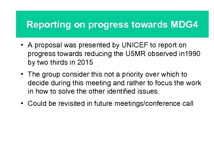 Reporting on progress towards MDG 4 • A proposal was presented by UNICEF to report on progress towards reducing the U 5 MR observed in 1990 by two thirds in 2015 • The group consider this not a priority over which to decide during this meeting and rather to focus the work in how to solve the other identified issues. • Could be revisited in future meetings/conference call