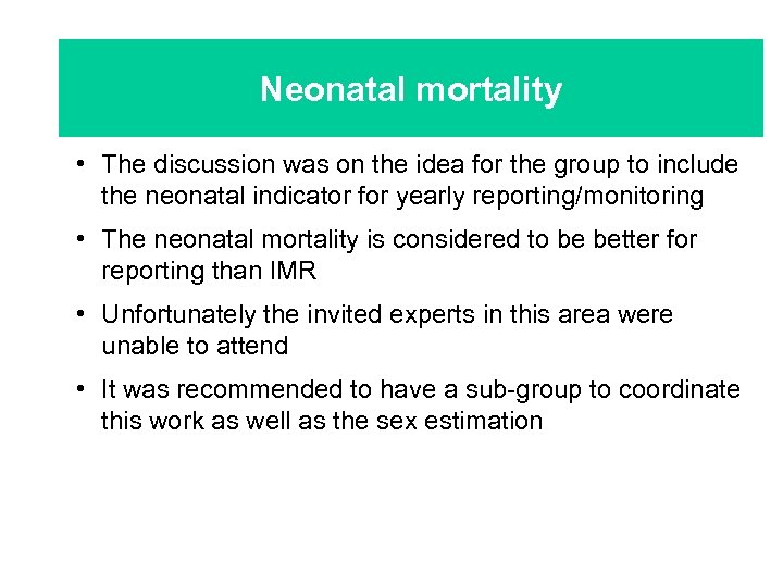 Neonatal mortality • The discussion was on the idea for the group to include the neonatal indicator for yearly reporting/monitoring • The neonatal mortality is considered to be better for reporting than IMR • Unfortunately the invited experts in this area were unable to attend • It was recommended to have a sub-group to coordinate this work as well as the sex estimation