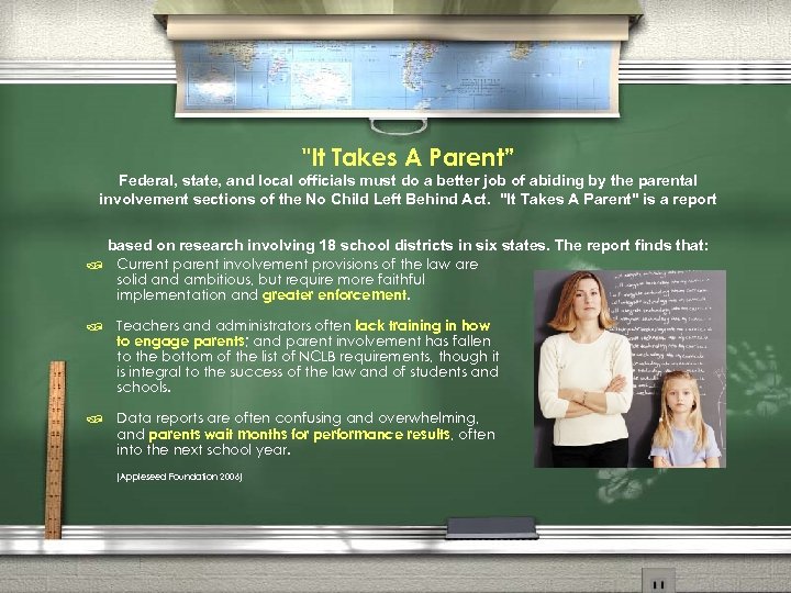 "It Takes A Parent” Federal, state, and local officials must do a better job of abiding by the parental involvement sections of the No Child Left Behind Act. "It Takes A Parent" is a report based on research involving 18 school districts in six states. The report finds that: / Current parent involvement provisions of the law are solid and ambitious, but require more faithful implementation and greater enforcement. / Teachers and administrators often lack training in how to engage parents; and parent involvement has fallen to the bottom of the list of NCLB requirements, though it is integral to the success of the law and of students and schools. / Data reports are often confusing and overwhelming, and parents wait months for performance results, often into the next school year. (Appleseed Foundation 2006)