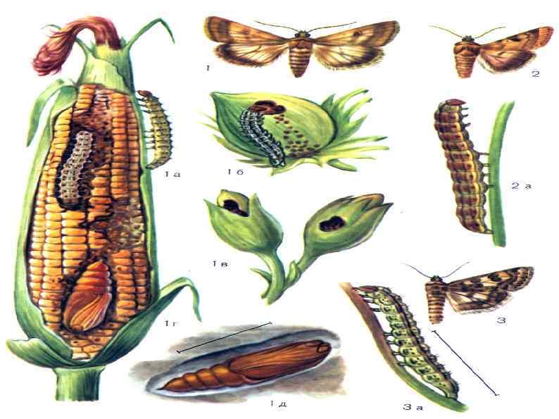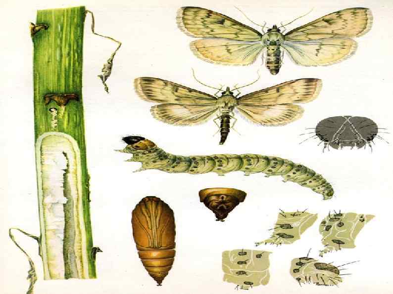 ● Stem borer (Pyraustanubilalis. Hb. ) Belongs to the family ognevok {Pyralididae), it is a dangerous and widespread pest of maize, millet and hemp. Plants caterpillar damage up to 25 mm, a yellow-gray; on the back runs a dark stripe, and each segment has four black panel; head, cervical and anal scutes brown; false leg with a rubber sole, hooks on it form an almost closed ring, and they are the longest in the middle of the ring. Age caterpillars are distinguished by the head capsule width: 1 st age - 0. 32 mm, 2 nd - 0. 53 3 rd - 0. 78 4 th - 1. 15 and 5 th 1. 43 mm. In the forest-steppe and steppe regions of Ukraine intensive breeding occurs in areas where hydrothermal coefficient for the period from 15 May to 10 July is 1. 2 -1. 8. Adult caterpillars overwinter inside krupnostebelnyh crops and weeds. Flight of butterflies occur in the southern area in the middle, and in steppe - at the end of June. After 4 -5 days after