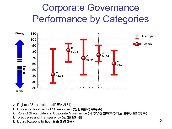 Corporate Governance Performance by Categories Strong Weak A: Rights of Shareholders (股東的權利) B: Equitable Treatment of Shareholders (對股東的公平待遇) C: Role of Stakeholders in Corporate Governance (利益關係團體在公司治理中扮演的角色) D: Disclosure and Transparency (公開與透明化) E: Board Responsibilities (董事會的責任) 15