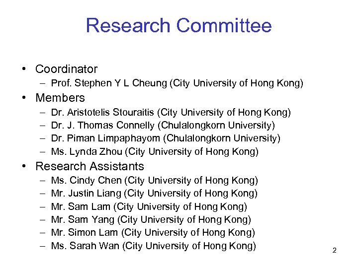 Research Committee • Coordinator – Prof. Stephen Y L Cheung (City University of Hong Kong) • Members – – Dr. Aristotelis Stouraitis (City University of Hong Kong) Dr. J. Thomas Connelly (Chulalongkorn University) Dr. Piman Limpaphayom (Chulalongkorn University) Ms. Lynda Zhou (City University of Hong Kong) • Research Assistants – – – Ms. Cindy Chen (City University of Hong Kong) Mr. Justin Liang (City University of Hong Kong) Mr. Sam Lam (City University of Hong Kong) Mr. Sam Yang (City University of Hong Kong) Mr. Simon Lam (City University of Hong Kong) Ms. Sarah Wan (City University of Hong Kong) 2