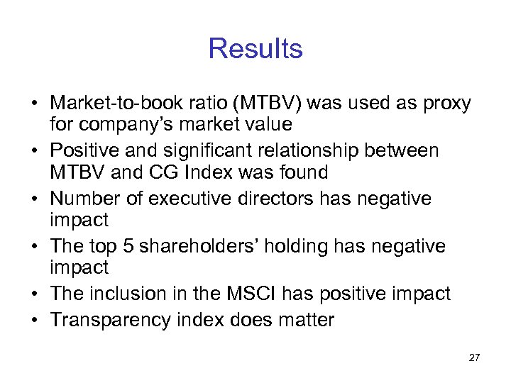 Results • Market-to-book ratio (MTBV) was used as proxy for company’s market value • Positive and significant relationship between MTBV and CG Index was found • Number of executive directors has negative impact • The top 5 shareholders’ holding has negative impact • The inclusion in the MSCI has positive impact • Transparency index does matter 27