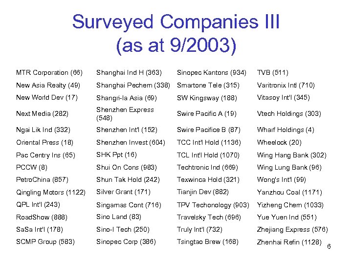 Surveyed Companies II (as at 9/2003) Esprit Holdings (330) GZI Transport (1052) HSBC Holdings (5) Jiangxi Copper (358) First Pacific (142) HAECO (44) Huadian Power (1071) Johnson Elec H (179) Fong's Ind (641) Hang Lung Group (10) Huaneng Power (902) K M Bus Hold (62) Forefront Int'l (885) Hang Lung Ppt (101) Hung Hing Print (450) K. Wah Int'l (173) Founder Hold (418) Hang Seng Bank (11) Hutch Harb Ring (715) Kerry Ppt (683) Fountain Set (420) Henderson Inv (97) Hutchison (13) Kingmaker (1170) Giordano Int'l (709) Henderson Land (12) Hysan Dev (14) LCH Bank (1111) Glorious Sun (393) HK & China Gas (3) i-Cable Comm (1097) Lenovo Group (992) Great Eagle H (41) HK Chinese Ltd (655) ICBC (Asia) (349) Lerado Group (1225) Guangdong Inv (270) HK Electric (6) IDT Int'l (167) Li & Fung (494) Guangnan (Hold) (1203) HK&S Hotels (45) Interchina Hold (202) Linmark Group (915) Guangshen Rail (525) HKEx (388) Intl Bk of Asia (636) Lippo China Res (156) Guangzhou Inv (123) HKR Int'l (480) JCG Holdings (626) Maanshan Iron (323) Guoco Group (53) Hopewell Hold (54) Jiangsu Express (177) Moulin Int'l (389) 5