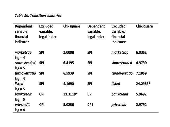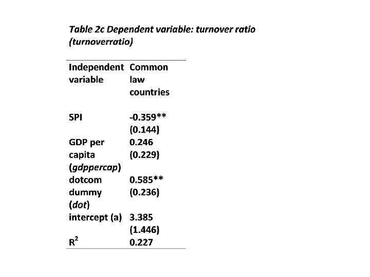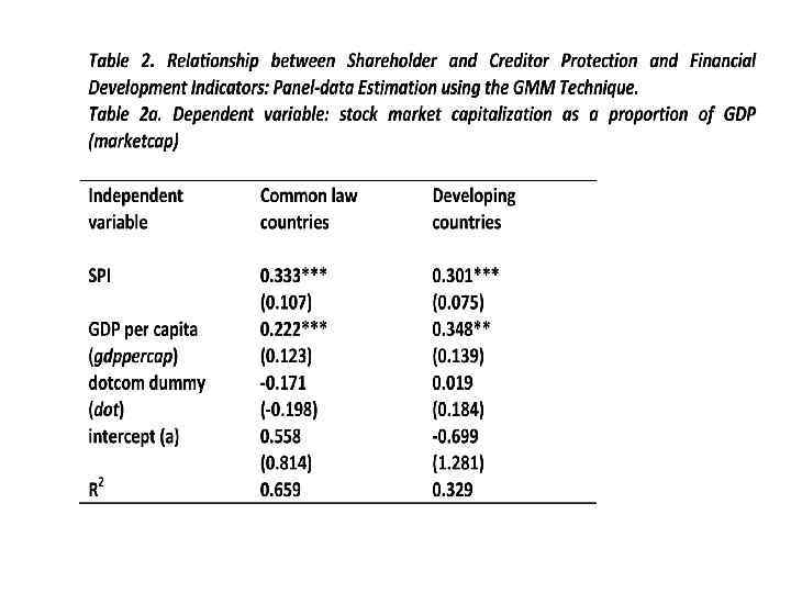 Anti-self dealing index Prospectus disclosure Creditor rights Labor regulation -0. 3334*** -0. 3928*** -0. 8394*** 0. 2654*** German legal -0. 3454*** origin -0. 2370** -0. 1714 0. 2337*** Scandinavian -0. 3830*** legal origin -0. 2867*** -0. 9345* 0. 3978*** GDP per capita 0. 0618** 0. 2022** -0. 0083 French legal origin 0. 0728***