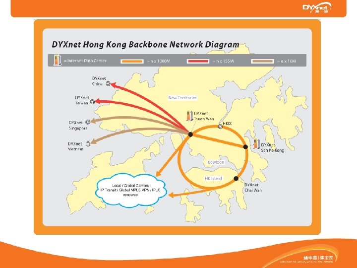 Background • Founded in 1999 by former senior management of PSINet HK • Operating in Hong Kong (HQ), Mainland China, Taiwan, Singapore and Vietnam • 400+ staff in 12 offices (plus 1, 000+ staff in IP Call Centres) • 6 IDCs (HK, BJ, SH, TP) & 4 IP Call Centres (BJ, SH, GZ) • 37 cities with Network POPs in Asia with services covering 700 cities • Serving over 6, 800 MPLS VPN clients’ sites and hosting over 5, 200 clients’ servers • Over 2, 500 enterprise clients across regions • The only foreign JV in PRC has nationwide IP VPN / IP Call Centre / IDC licenses