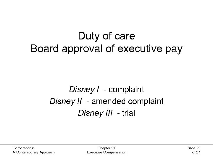 Duty of care Board approval of executive pay Disney I - complaint Disney II - amended complaint Disney III - trial Corporations: A Contemporary Approach Chapter 21 Executive Compensation Slide 22 of 27