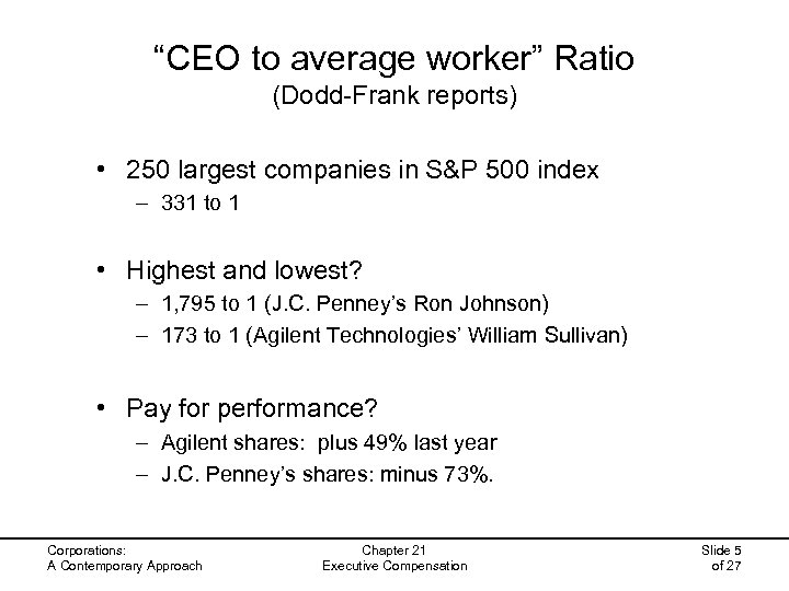 “CEO to average worker” Ratio (Dodd-Frank reports) • 250 largest companies in S&P 500 index – 331 to 1 • Highest and lowest? – 1, 795 to 1 (J. C. Penney’s Ron Johnson) – 173 to 1 (Agilent Technologies’ William Sullivan) • Pay for performance? – Agilent shares: plus 49% last year – J. C. Penney’s shares: minus 73%. Corporations: A Contemporary Approach Chapter 21 Executive Compensation Slide 5 of 27