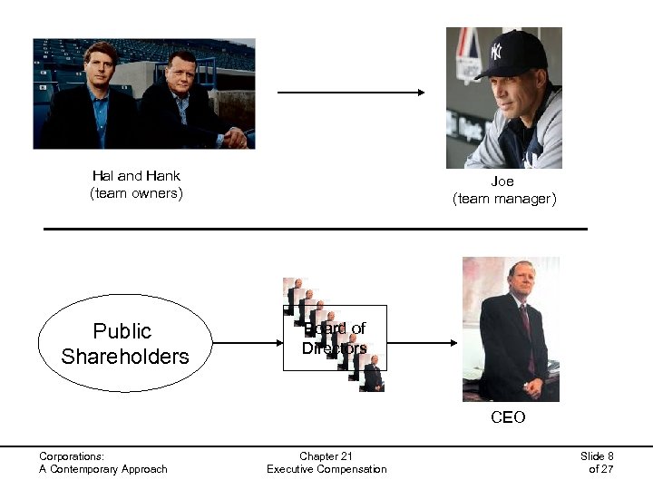 Hal and Hank (team owners) Public Shareholders Joe (team manager) Board of Directors CEO Corporations: A Contemporary Approach Chapter 21 Executive Compensation Slide 8 of 27