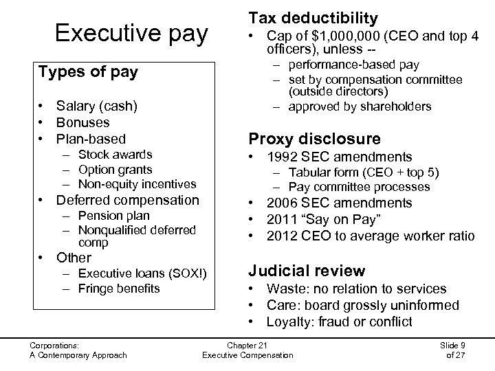 Executive pay • Cap of $1, 000 (CEO and top 4 officers), unless -– performance-based pay – set by compensation committee (outside directors) – approved by shareholders Types of pay • Salary (cash) • Bonuses • Plan-based Proxy disclosure – Stock awards – Option grants – Non-equity incentives • 1992 SEC amendments • Deferred compensation – Pension plan – Nonqualified deferred comp • Other – Executive loans (SOX!) – Fringe benefits Corporations: A Contemporary Approach Tax deductibility – Tabular form (CEO + top 5) – Pay committee processes • 2006 SEC amendments • 2011 “Say on Pay” • 2012 CEO to average worker ratio Judicial review • Waste: no relation to services • Care: board grossly uninformed • Loyalty: fraud or conflict Chapter 21 Executive Compensation Slide 9 of 27