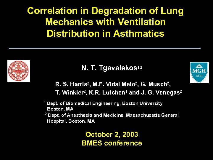 Correlation in Degradation of Lung Mechanics with Ventilation Distribution in Asthmatics N. T. Tgavalekos 1, 2 R. S. Harris 2, M. F. Vidal Melo 2, G. Musch 2, T. Winkler 2, K. R. Lutchen 1 and J. G. Venegas 2 1 Dept. of Biomedical Engineering, Boston University, Boston, MA 2 Dept. of Anesthesia and Medicine, Massachusetts General Hospital, Boston, MA October 2, 2003 BMES conference