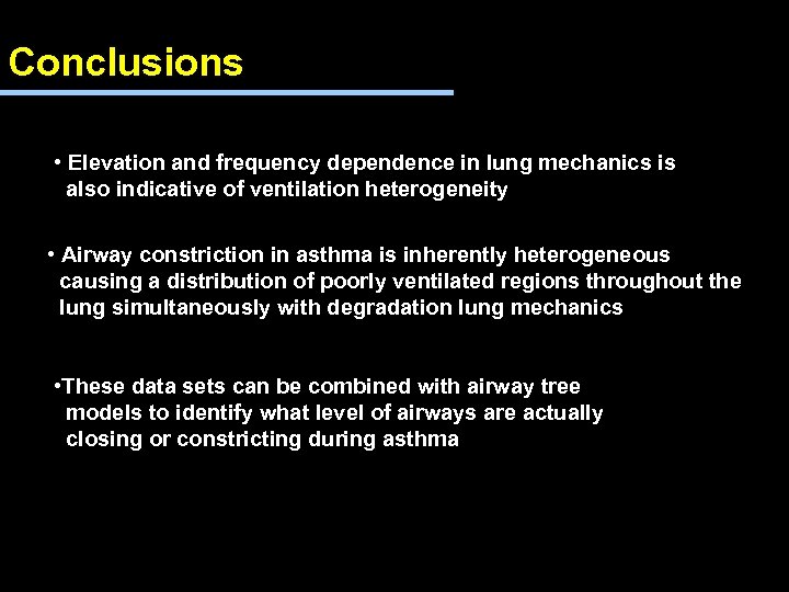 Conclusions • Elevation and frequency dependence in lung mechanics is also indicative of ventilation heterogeneity • Airway constriction in asthma is inherently heterogeneous causing a distribution of poorly ventilated regions throughout the lung simultaneously with degradation lung mechanics • These data sets can be combined with airway tree models to identify what level of airways are actually closing or constricting during asthma