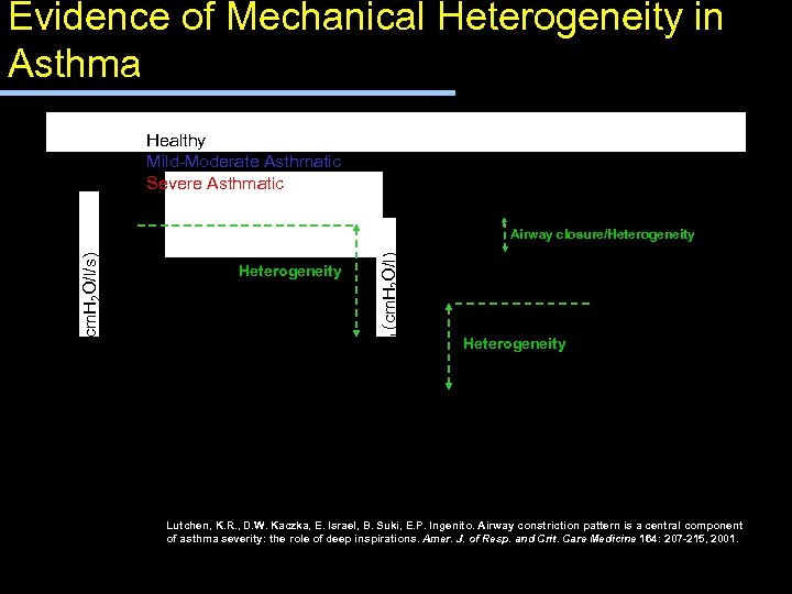 Evidence of Mechanical Heterogeneity in Asthma Healthy Mild-Moderate Asthmatic Severe Asthmatic Heterogeneity EL(cm. H 2 O/l) RL(cm. H 2 O/l/s) Airway closure/Heterogeneity Lutchen, K. R. , D. W. Kaczka, E. Israel, B. Suki, E. P. Ingenito. Airway constriction pattern is a central component of asthma severity: the role of deep inspirations. Amer. J. of Resp. and Crit. Care Medicine 164: 207 -215, 2001.