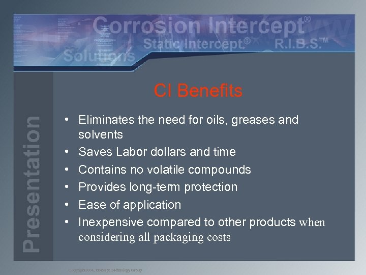 CI Benefits • Eliminates the need for oils, greases and solvents • Saves Labor dollars and time • Contains no volatile compounds • Provides long-term protection • Ease of application • Inexpensive compared to other products when considering all packaging costs Copyright 2004, Intercept Technology Group