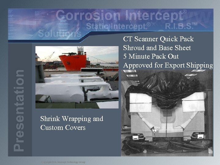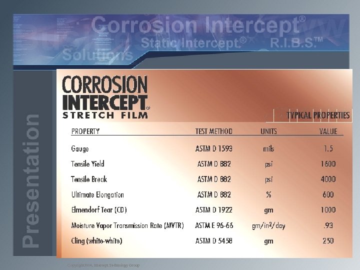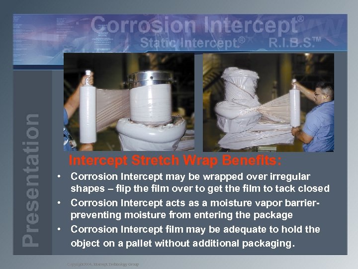 Intercept Stretch Wrap Benefits: • Corrosion Intercept may be wrapped over irregular shapes – flip the film over to get the film to tack closed • Corrosion Intercept acts as a moisture vapor barrierpreventing moisture from entering the package • Corrosion Intercept film may be adequate to hold the object on a pallet without additional packaging. Copyright 2004, Intercept Technology Group