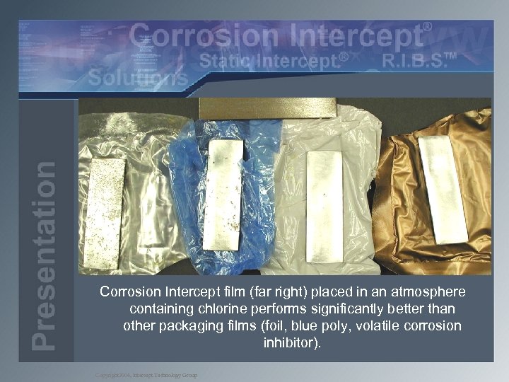 Corrosion Intercept film (far right) placed in an atmosphere containing chlorine performs significantly better than other packaging films (foil, blue poly, volatile corrosion inhibitor). Copyright 2004, Intercept Technology Group