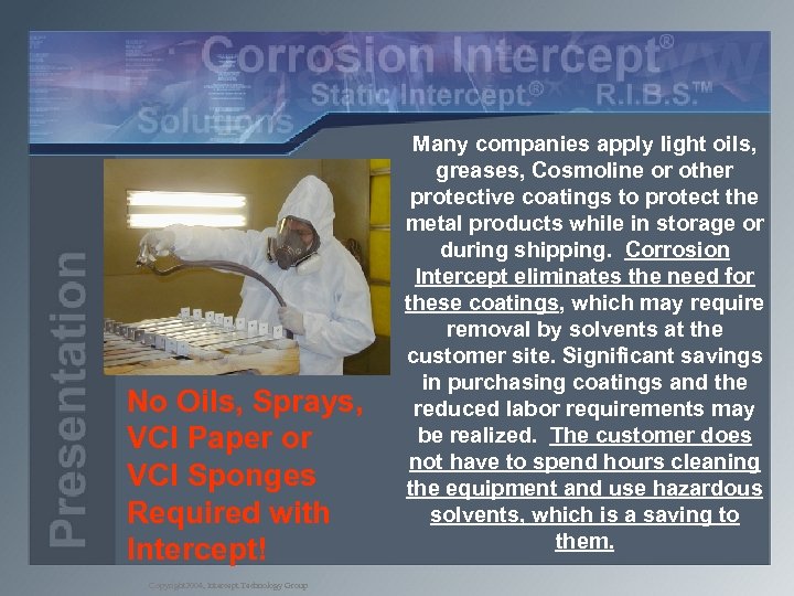 No Oils, Sprays, VCI Paper or VCI Sponges Required with Intercept! Copyright 2004, Intercept Technology Group Many companies apply light oils, greases, Cosmoline or other protective coatings to protect the metal products while in storage or during shipping. Corrosion Intercept eliminates the need for these coatings, which may require removal by solvents at the customer site. Significant savings in purchasing coatings and the reduced labor requirements may be realized. The customer does not have to spend hours cleaning the equipment and use hazardous solvents, which is a saving to them.