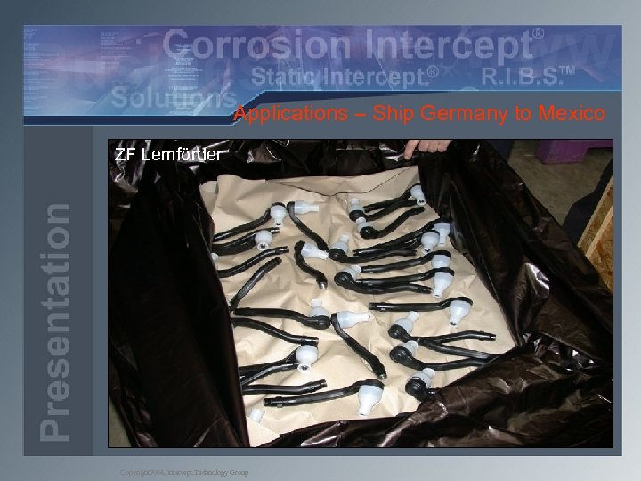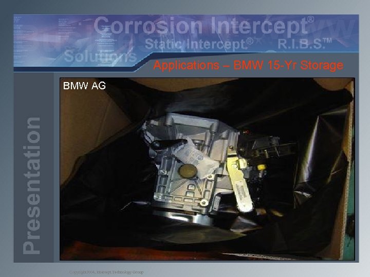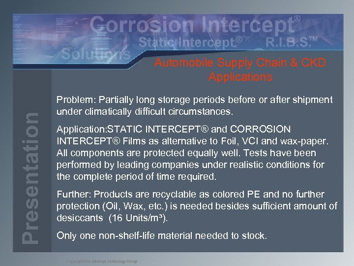 Automobile Supply Chain & CKD Applications Problem: Partially long storage periods before or after shipment under climatically difficult circumstances. Application: STATIC INTERCEPT® and CORROSION INTERCEPT® Films as alternative to Foil, VCI and wax-paper. All components are protected equally well. Tests have been performed by leading companies under realistic conditions for the complete period of time required. Further: Products are recyclable as colored PE and no further protection (Oil, Wax, etc. ) is needed besides sufficient amount of desiccants (16 Units/m³). Only one non-shelf-life material needed to stock. Copyright 2004, Intercept Technology Group