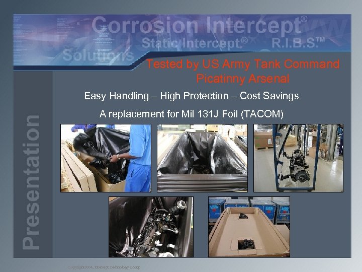 Tested by US Army Tank Command Picatinny Arsenal Easy Handling – High Protection – Cost Savings A replacement for Mil 131 J Foil (TACOM) Copyright 2004, Intercept Technology Group
