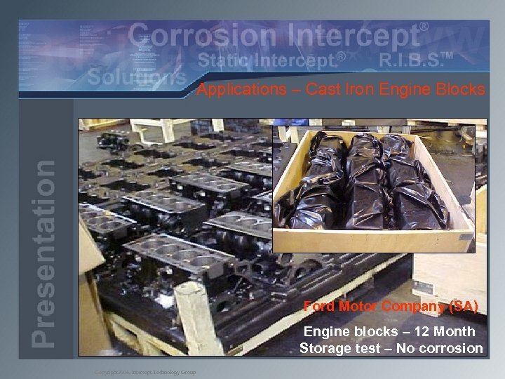 Applications – Cast Iron Engine Blocks Ford Motor Company (SA) Engine blocks – 12 Month Storage test – No corrosion Copyright 2004, Intercept Technology Group