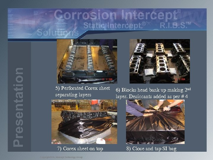 5) Perforated Corex sheet separating layers 7) Corex sheet on top Copyright 2004, Intercept Technology Group 6) Blocks head bank up making 2 nd layer. Desiccants added as per # 4 8) Close and tap SI bag