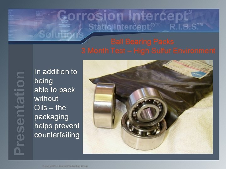 Ball Bearing Packs 3 Month Test – High Sulfur Environment In addition to being able to pack without Oils – the packaging helps prevent counterfeiting Copyright 2004, Intercept Technology Group