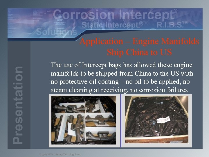 Application – Engine Manifolds Ship China to US The use of Intercept bags has allowed these engine manifolds to be shipped from China to the US with no protective oil coating – no oil to be applied, no steam cleaning at receiving, no corrosion failures Copyright 2004, Intercept Technology Group