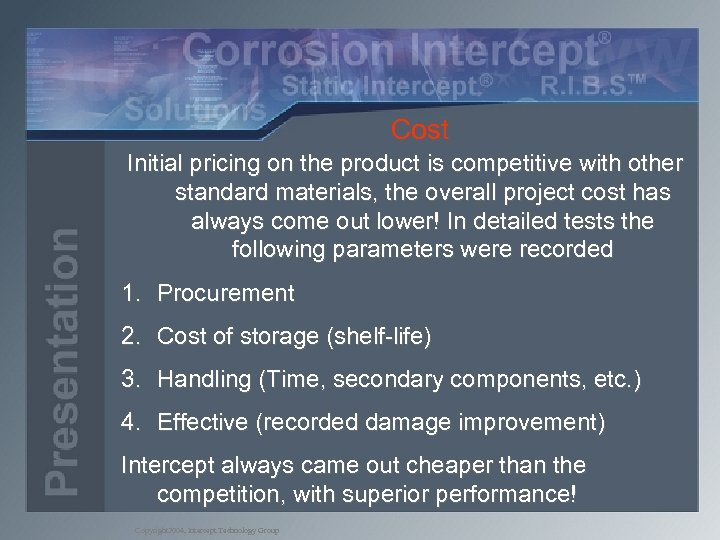 Cost Initial pricing on the product is competitive with other standard materials, the overall project cost has always come out lower! In detailed tests the following parameters were recorded 1. Procurement 2. Cost of storage (shelf-life) 3. Handling (Time, secondary components, etc. ) 4. Effective (recorded damage improvement) Intercept always came out cheaper than the competition, with superior performance! Copyright 2004, Intercept Technology Group