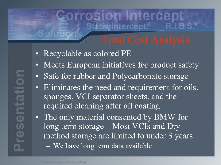 Total Cost Analysis • • Recyclable as colored PE Meets European initiatives for product safety Safe for rubber and Polycarbonate storage Eliminates the need and requirement for oils, sponges, VCI separator sheets, and the required cleaning after oil coating • The only material consented by BMW for long term storage – Most VCIs and Dry method storage are limited to under 3 years – We have long term data available Copyright 2004, Intercept Technology Group