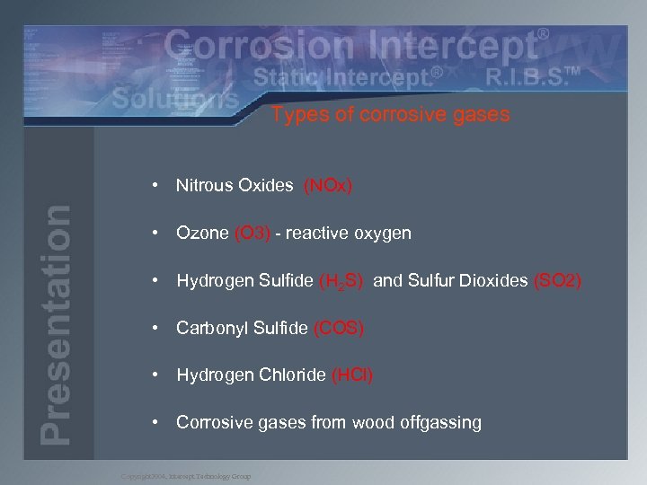 Types of corrosive gases • Nitrous Oxides (NOx) • Ozone (O 3) - reactive oxygen • Hydrogen Sulfide (H 2 S) and Sulfur Dioxides (SO 2) • Carbonyl Sulfide (COS) • Hydrogen Chloride (HCl) • Corrosive gases from wood offgassing Copyright 2004, Intercept Technology Group