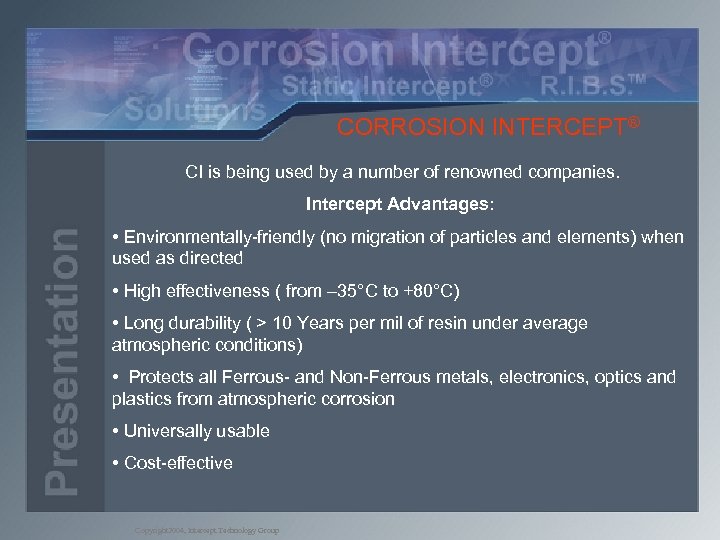 CORROSION INTERCEPT® CI is being used by a number of renowned companies. Intercept Advantages: • Environmentally-friendly (no migration of particles and elements) when used as directed • High effectiveness ( from – 35°C to +80°C) • Long durability ( > 10 Years per mil of resin under average atmospheric conditions) • Protects all Ferrous- and Non-Ferrous metals, electronics, optics and plastics from atmospheric corrosion • Universally usable • Cost-effective Copyright 2004, Intercept Technology Group