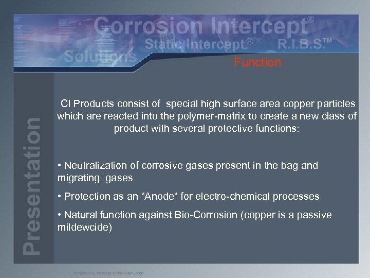 Function CI Products consist of special high surface area copper particles which are reacted into the polymer-matrix to create a new class of product with several protective functions: • Neutralization of corrosive gases present in the bag and migrating gases • Protection as an “Anode“ for electro-chemical processes • Natural function against Bio-Corrosion (copper is a passive mildewcide) Copyright 2004, Intercept Technology Group