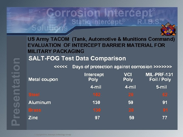 US Army TACOM (Tank, Automotive & Munitions Command) EVALUATION OF INTERCEPT BARRIER MATERIAL FOR MILITARY PACKAGING SALT-FOG Test Data Comparison <<<<< Metal coupon Days of protection against corrosion >>>>>>> Intercept Poly VCI Poly MIL-PRF-131 Foil / Poly 4 -mil Steel 102 28 62 Aluminum 130 59 91 Brass 130 28 91 97 59 77 Zinc Copyright 2004, Intercept Technology Group 5 -mil
