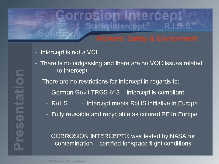 Workers‘ Safety & Environment - Intercept is not a VCI - There is no outgassing and there are no VOC issues related to Intercept - There are no restrictions for Intercept in regards to: - German Gov’t TRGS 615 – Intercept is compliant - Ro. HS - Intercept meets Ro. HS initiative in Europe - Fully reusable and recyclable as colored PE in Europe CORROSION INTERCEPT® was tested by NASA for contamination – certified for space-flight conditions Copyright 2004, Intercept Technology Group