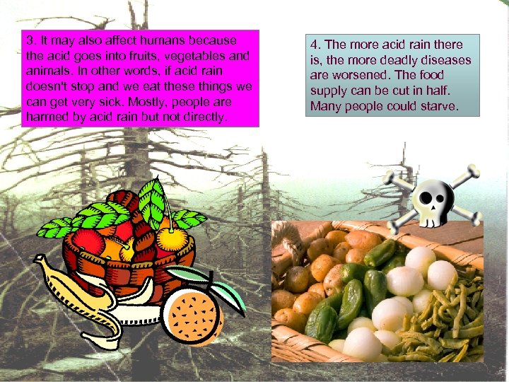 3. It may also affect humans because the acid goes into fruits, vegetables and animals. In other words, if acid rain doesn't stop and we eat these things we can get very sick. Mostly, people are harmed by acid rain but not directly. 4. The more acid rain there is, the more deadly diseases are worsened. The food supply can be cut in half. Many people could starve.
