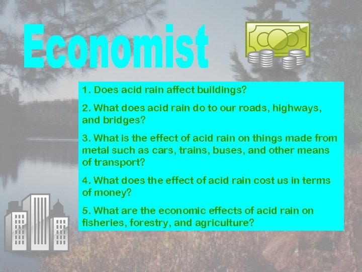 1. Does acid rain affect buildings? 2. What does acid rain do to our roads, highways, and bridges? 3. What is the effect of acid rain on things made from metal such as cars, trains, buses, and other means of transport? 4. What does the effect of acid rain cost us in terms of money? 5. What are the economic effects of acid rain on fisheries, forestry, and agriculture?