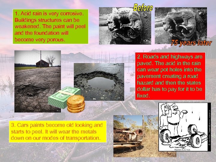 1. Acid rain is very corrosive. Buildings structures can be weakened. The paint will peel and the foundation will become very porous. 2. Roads and highways are paved. The acid in the rain can wear pot holes into the pavement creating a road hazard and then the states dollar has to pay for it to be fixed. 3. Cars paints become old looking and starts to peel. It will wear the metals down on our modes of transportation.