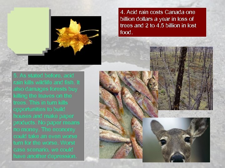 4. Acid rain costs Canada one billion dollars a year in loss of trees and 2 to 4. 5 billion in lost food. 5. As stated before, acid rain kills wildlife and fish. It also damages forests buy killing the leaves on the trees. This in turn kills opportunities to build houses and make paper products. No paper means no money. The economy could take an even worse turn for the worse. Worst case scenario, we could have another depression.